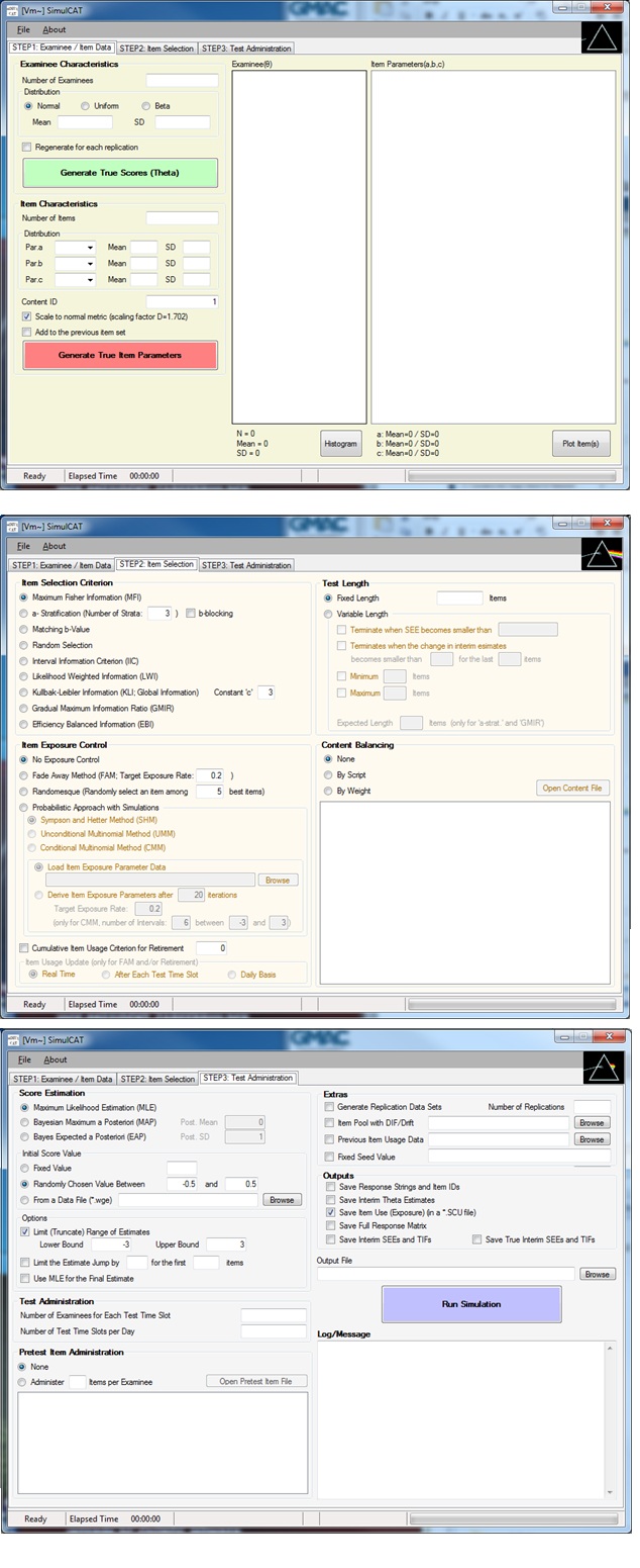 As a Windows-based application, SimulCAT provides a user-friendly graphical interface. Most features of SimulCAT can be accessed by just a few simple point-and-clicks. The main interface of SimulCAT consists of easy-to-follow three steps: Examinee/Item Data, Item Selection, and Test Administration.